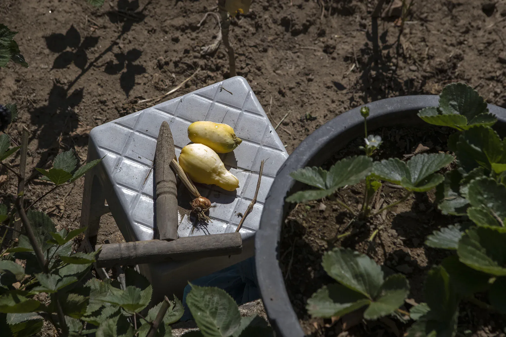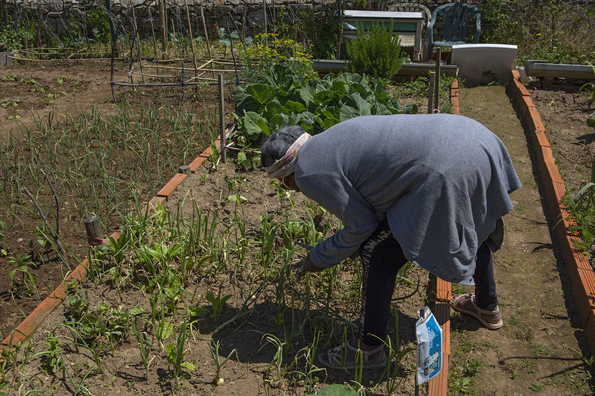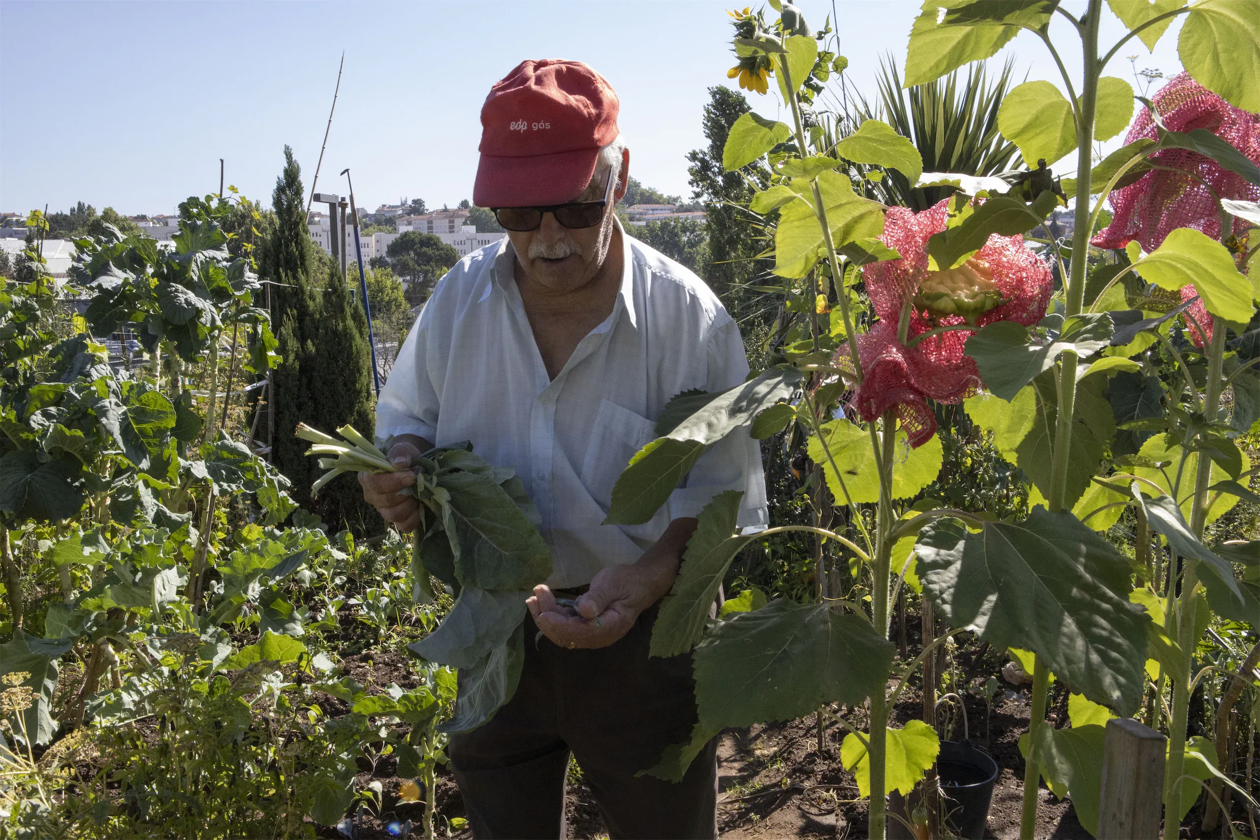 São 9h da matina, mas o dia já vai longo para Gilberto Branco. “Muitas vezes acordo com o nascer do sol para vir para cá”, diz, apoiado na sachola e resmungando com os caracóis que lhe querem comer os pimentos e com o bicho do feijão a trepar pelo pé miúdo. “Olha os malucos a subirem já por aqui! O que vale é que as formigas tratam deles”. A energia dos seus 71 anos é igual à de um catraio, até porque se não andar por ali, a cavar e a semear, a cabeça não anda bem. “Se não fosse a minha hortinha, dava em maluco.”